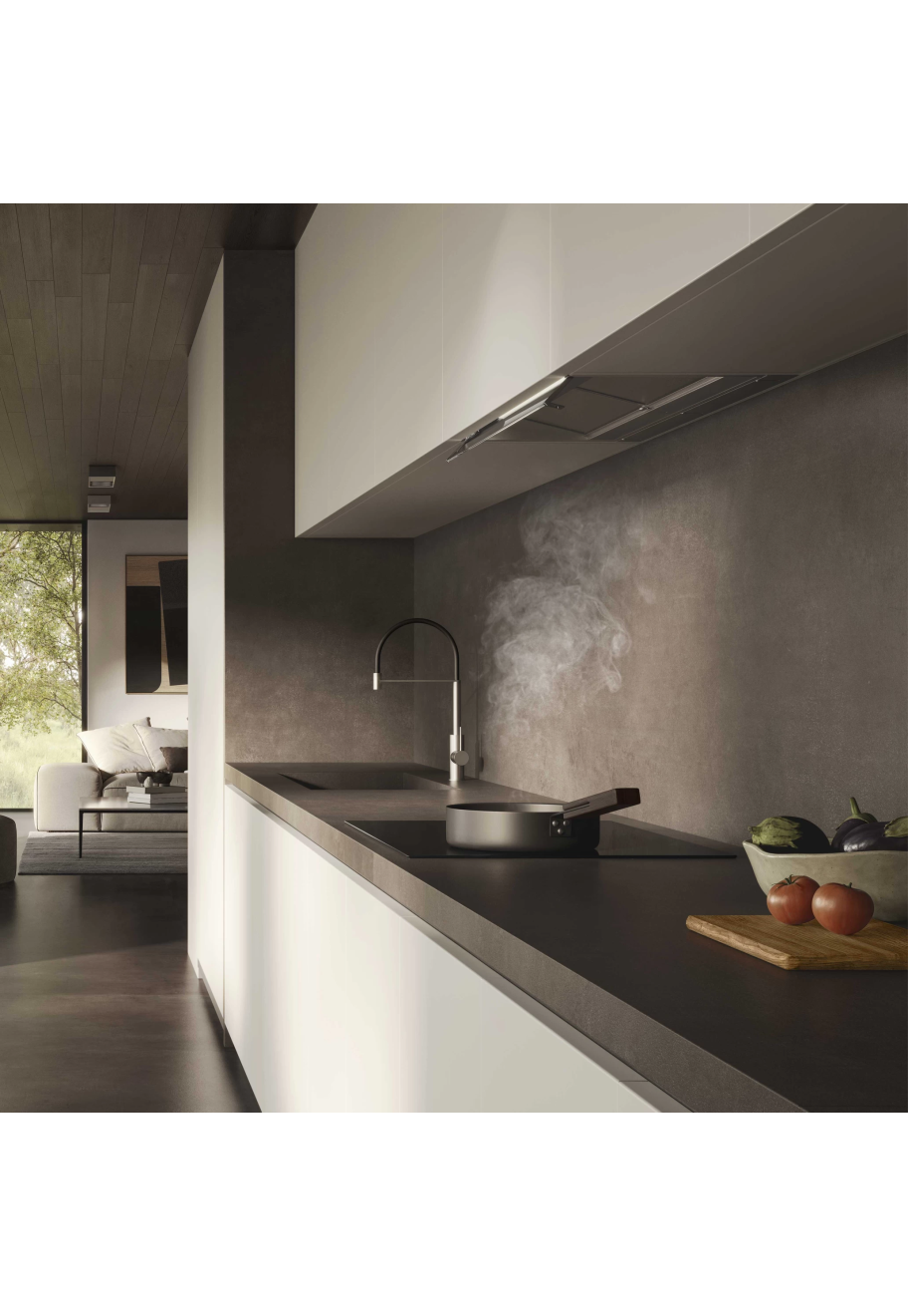 Puede activarse, regularse y apagarse por sí misma cuando el aire no está limpio. Esta campana protege los muebles superiores del desgaste causado por una formación excesiva de vapor y condensación. La conexión permite gestionarla a distancia, a través de una aplicación o un asistente de voz y puede conectarse mediante bluetooth a una placa de inducción Elica, regulando la potencia de extracción según las zonas de cocción activas. La aplicación también permite ponerse en contacto de inmediato con el servicio de asistencia y controlar el estado de los filtros. Su diseño, caracterizado por las protecciones laterales, está concebido para proteger los muebles superiores de la cocina. Se puede regular la potencia luminosa según sea necesario.